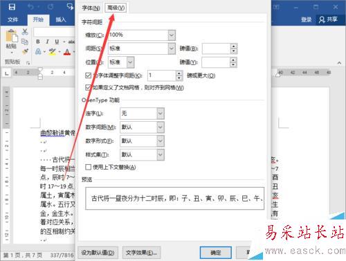 4、在打開(kāi)的字體對(duì)話框中,將選項(xiàng)卡切換到“高級(jí)”選項(xiàng)卡欄。如圖所示;