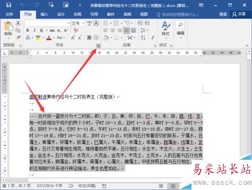 2、在打開(kāi)的Word文檔窗口中,選中需要設(shè)置間距的文字內(nèi)容,然后在點(diǎn)擊開(kāi)始菜單選項(xiàng)卡的字體分區(qū)功能區(qū)的功能按鈕。如圖所示;