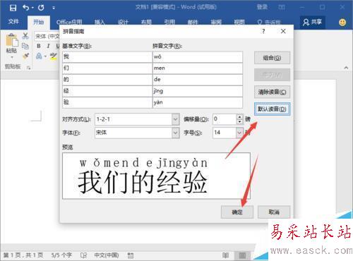 5、在“拼音指南”對(duì)話窗口,點(diǎn)擊“默認(rèn)讀音”按鈕,然后再點(diǎn)擊“確定”按鈕。如圖所示;