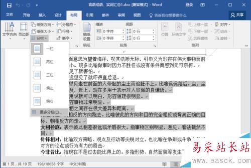 3、點(diǎn)擊“布局”里的“分欄”,選擇“更多分欄”,如下圖所示: