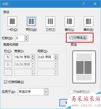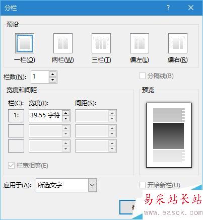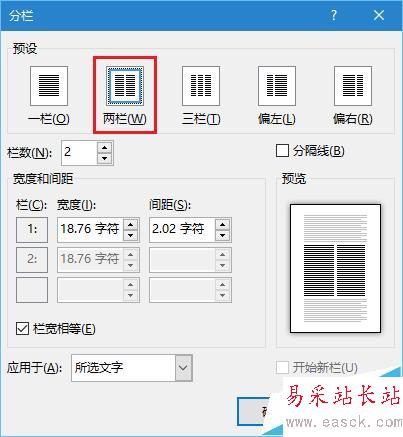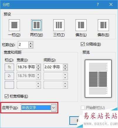 7、應(yīng)用于選項(xiàng)一定要是“所選文字”,不然整篇文章都會(huì)成為兩欄。