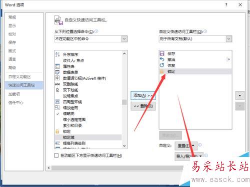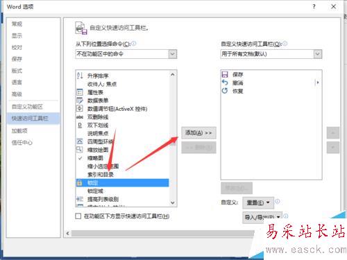 6、在“快速訪問工具欄”選項卡的右側窗格中,找到“不再功能區中的命令”區域中的“鎖定”,并將點擊添加按鈕。如圖所示;