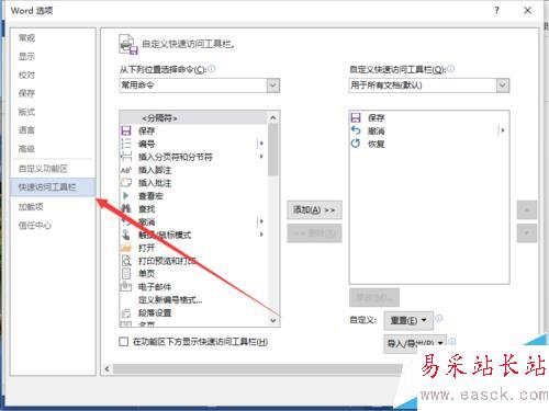 5、在彈出的“Word選項”對話框中,選擇并點擊“快速訪問工具欄”選項卡欄。如圖所示;