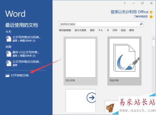 1、在計算機桌面上的Word2016文檔程序圖標雙擊鼠標左鍵,將其打開運行。并點擊左側窗格的“打開其他文檔”選項,打開我們需要編輯文檔。如圖所示;