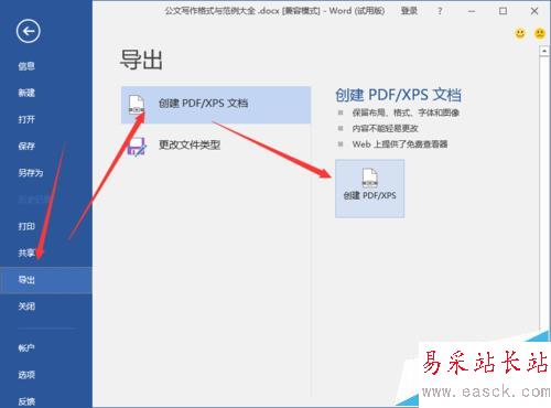 3、在打開的文件選項窗口界面中,依次點擊“導出”-->“創建PDF/XPS文檔”-->“創建PDF/XPS”選項命令。如圖所示;
