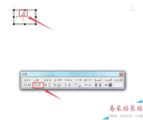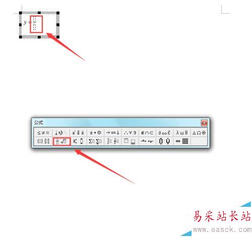 8、讓光標在分式的分子上面,然后選中公式里的分式和根式模板,在下拉菜單里選擇開方符號,在編輯區(qū)就出現(xiàn)了開方符號,如圖所示: