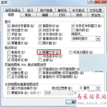 在視圖選項卡,格式標記中,勾選隱藏文字,確定。