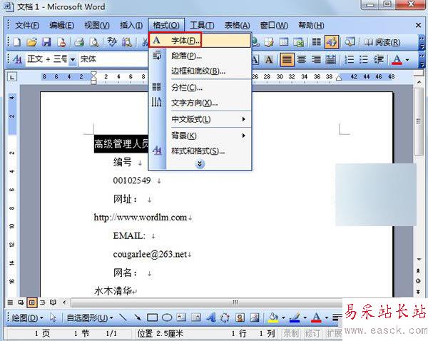 啟動Word2003,鼠標選中需要進行“隱藏”的文字,單擊菜單欄--格式--字體。