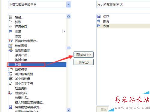 5、之后在下面的滾動列表,一直往下拉,找到其中有一個【計算】功能的選項,選中它點擊中間的添加按鈕,當【計算】功能從左邊跑到右邊之后,再點擊右下角的確定按鈕