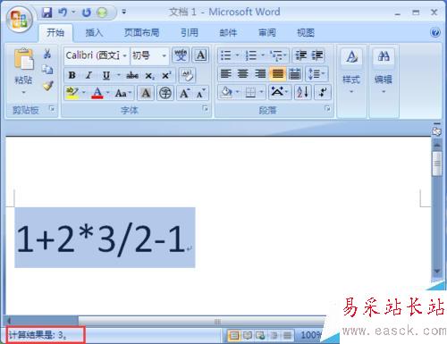 7、下面我在Word中隨便輸入一個運算演示:1+2*3/2-1,根據數學中的四則混合運算,結果應為:3,首先我先選中這個運算,然后點擊【自定義快捷訪問工具欄】中的【計算】功能命令按鈕,這個時候默認會把計算結果粘貼到 “剪切板”中,同時在左下角的狀態欄上也會顯示計算結果,同時你在需要填寫計算結果的地方粘貼一下就能看到結果,是不是很神奇!