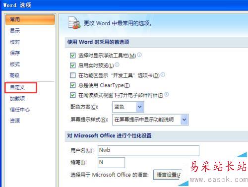 3、在彈出的【Word選項】窗口中,左邊一欄找到【自定義】選項并點擊