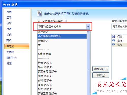 4、在中間從下列位置選擇命令下拉框中選擇【不在功能區中命令】