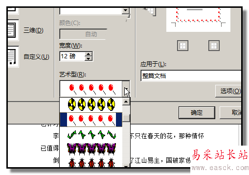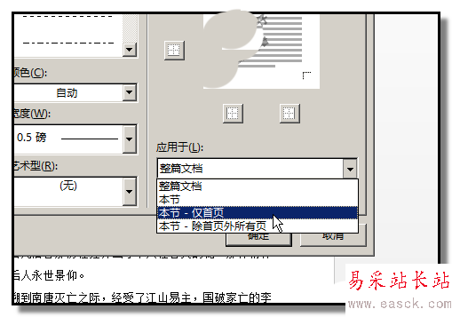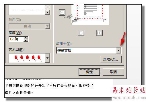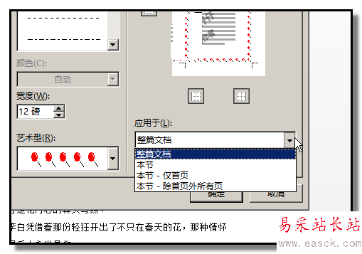 5、在“應用于”這里,默認是此邊框是應用于整個文檔。我們可以點下小三角,在彈出的菜單中選擇此邊框應用于哪個。