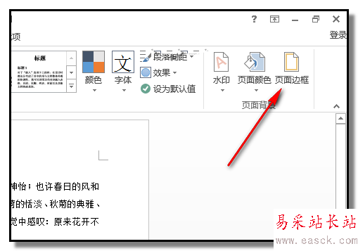2、我們用鼠標在“設計”選項卡這里點下,在下方展開的各項命令中,在右側,點下“頁面邊框”