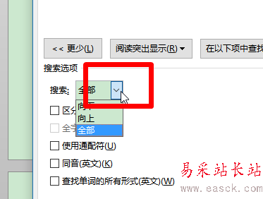 5、在彈出的頁面中左鍵單擊“搜索”下拉列表框右側的下拉按鈕,選擇要查詢的范圍。