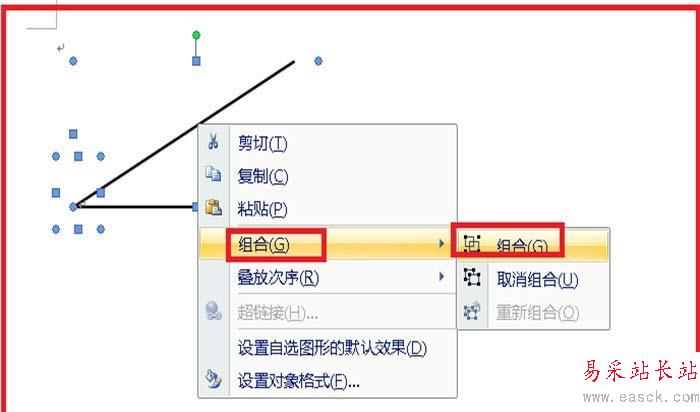 5、單擊選中其中的一條直線,進行移動,形成角,單擊選中一條直線,按下鍵盤上的shift鍵不放,再單擊另一條直線,就同時選中了兩直線,再單擊右鍵,找到組合,單擊一下,再單擊組合,兩條直線就成一個整體角了。