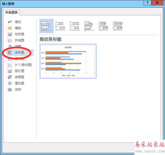 4、彈出了圖表對話框。如圖。我們選擇條形圖。如圖。