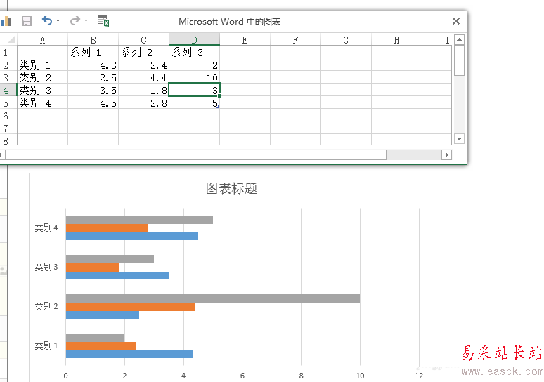 5、好,就設置出了一個條形圖。如圖。我們可以雙擊表格的數據,改變從而改變條形圖的分布