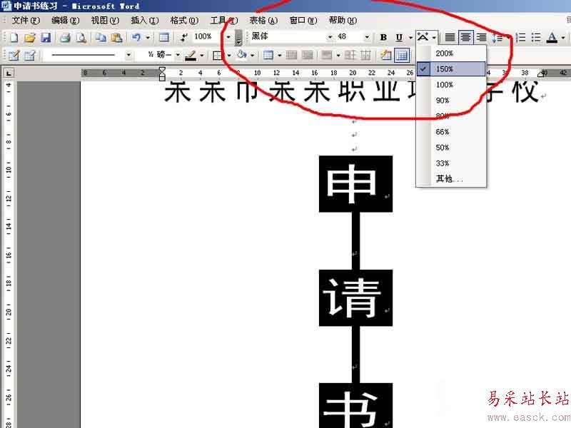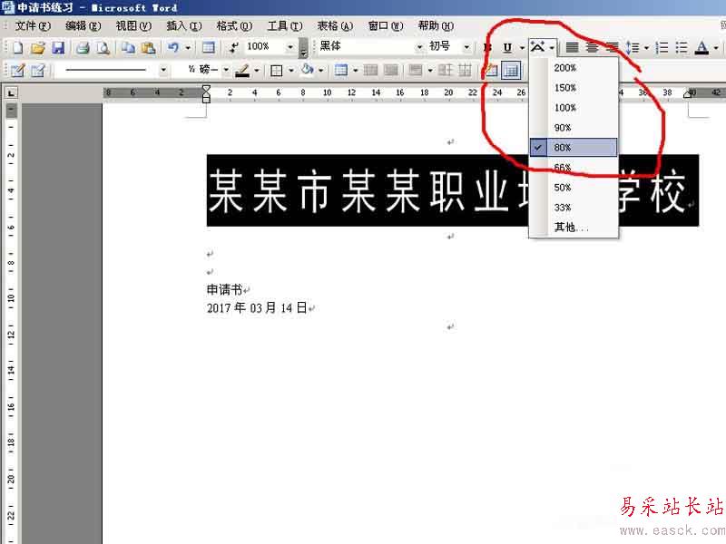 3、將標(biāo)題居中設(shè)為黑體小初號,然后單擊格式工具欄上的“字符縮放”設(shè)為80%。