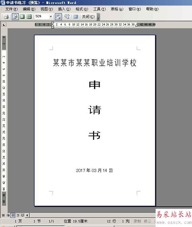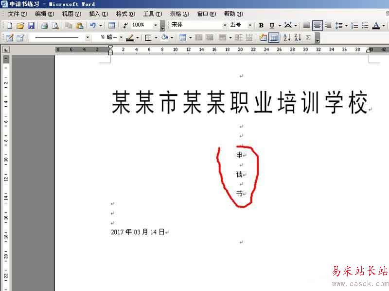 4、將“申請書”三個字居中,在每個字后均按兩下回車鍵,變成豎向