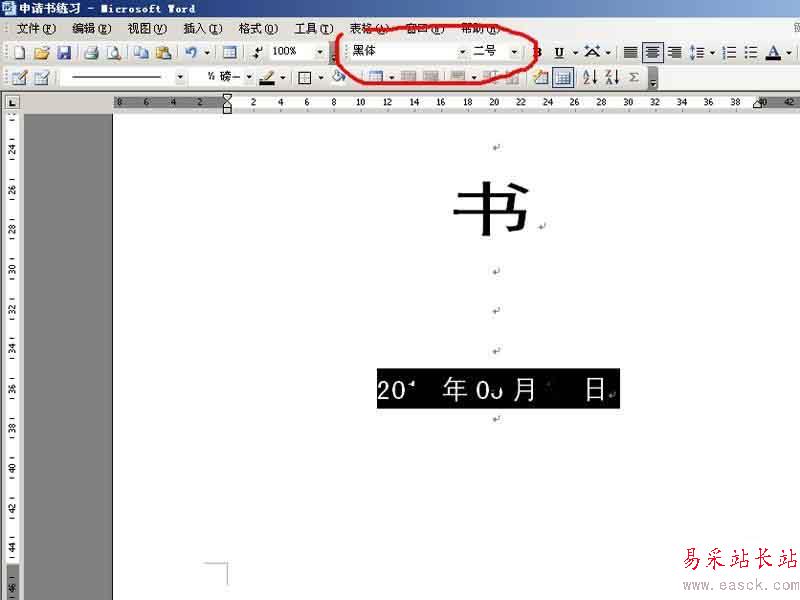 6、*將“年月日”按回車向下串幾行,設(shè)為居中對齊黑體二號大小。