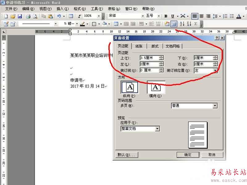 *然后進(jìn)行頁面設(shè)置:文件菜單----頁面設(shè)置:紙張根據(jù)需要可以設(shè)為A4或B5紙,頁邊距方向為縱向,頁邊距上邊距為3厘米,下左右邊距均為2厘米。