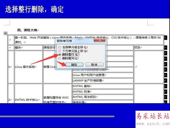 在彈出的對話框里,選擇“整行刪除”,點擊“確定”。這樣就能刪除選中的單元格表格。