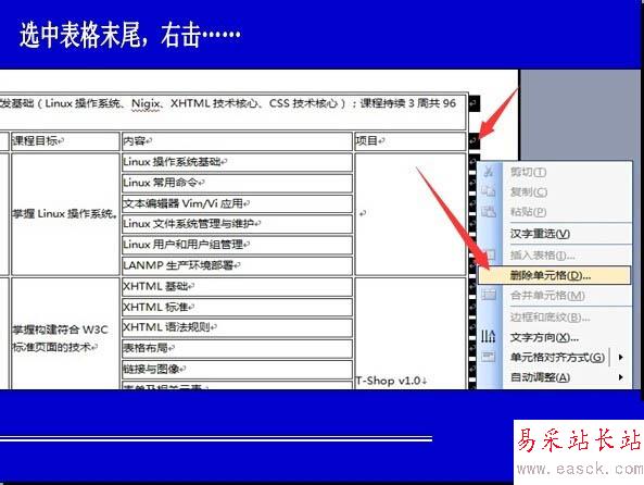 方法1:用鼠標選中表格末尾,點擊右鍵,在彈出的對話框里選擇“刪除單元格”