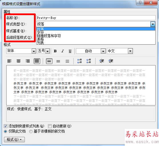 3、在word新建樣式的窗口中可以設置word樣式的名稱、word樣式的類型以及word樣式基準等。