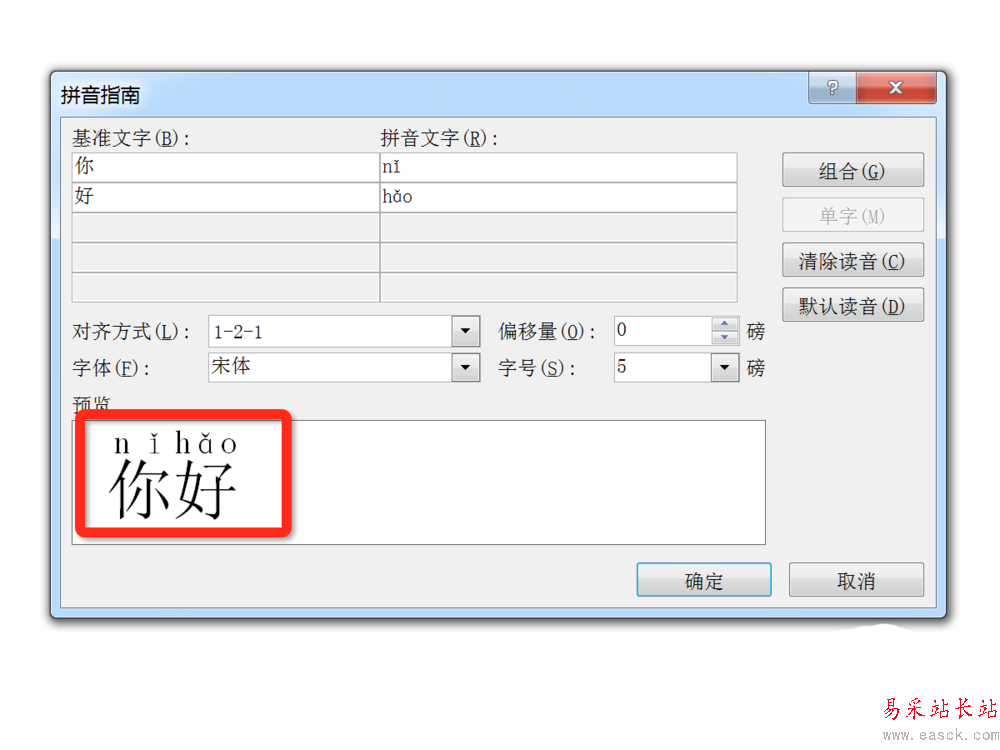 5、可以看到預(yù)覽中已經(jīng)標(biāo)注拼音了,點(diǎn)“確定”既可