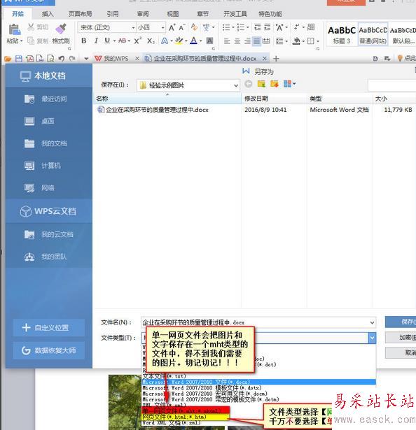 3、在【另存為】對話框下方【文件類型】處,選擇【網頁文件】。不要選擇其它文件類型。