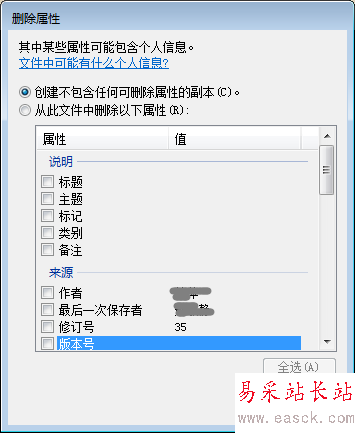 4、點擊選擇 從此文件中刪除以下屬性 ,并單擊 全選 按鈕,點擊 確定。