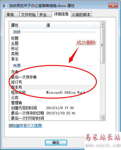 5、查看文檔右鍵屬性-詳細信息,屬性和個人信息消失,刪除成功。