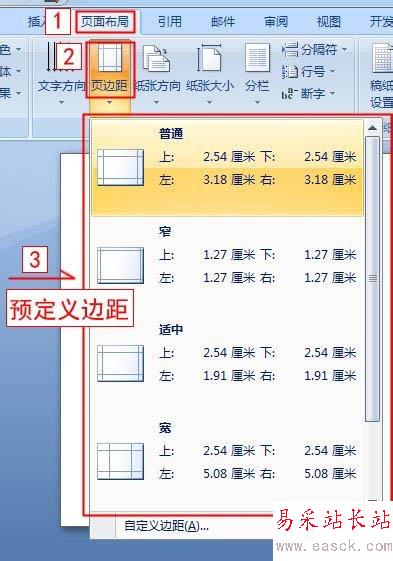 預定義邊距,【頁面布局】-【頁邊距】-【預定義邊距】。