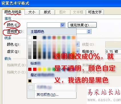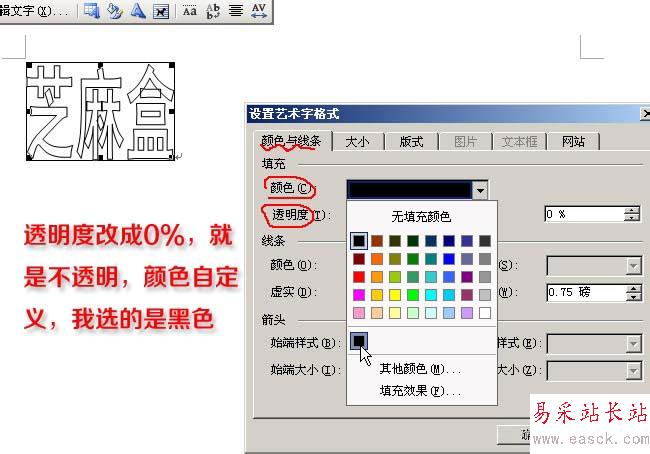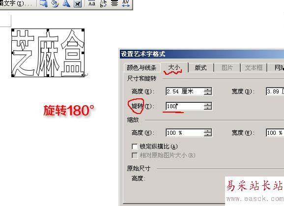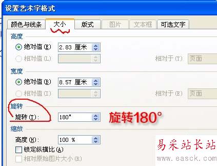 同樣的,選中文字右鍵,選藝術字格式,同樣修改“顏色和線條”和“大小”,顏色自定,透明度0%,旋轉(zhuǎn)180°