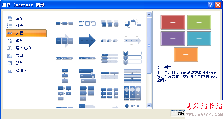 方法一:最簡單的方法就是使用word中自帶的流程圖。具體操作流程為:選擇“插入”菜單,然后選擇上方的“smartart”功能,在彈出來的窗口中選擇“流程”。