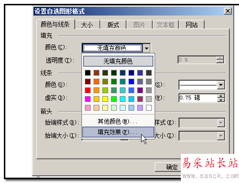 7、然后,在“填充顏色”這里三角點下,彈出的菜單中點“填充效果”;