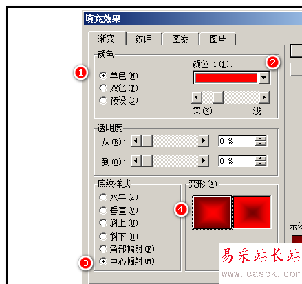 8、彈出填充效果的操作框;在“顏色”這里點選“單色”;在“顏色1”這里選擇紅色;在“底紋樣式”這里點選“中心輻射”;在“變形”這里選擇第一種;然后,點確定。