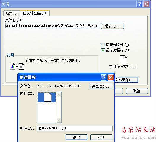 5、插入之后可以進行圖標的更改,一般你插入的文件是什么類型的,對應的圖標就是什么樣的,譬如你插入word,我插入的是txt,所以圖標是一塊白色的。