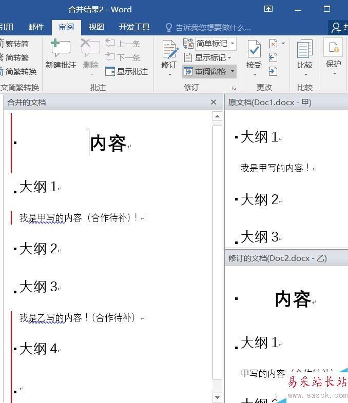 合并后,甲乙寫作的部分都已經合并到相應位置(注意,前提是文章大綱的格式一致),不過處于修訂狀態。