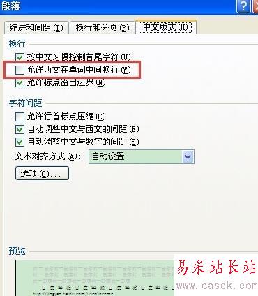 4、我們勾選這個“允許西文在單詞中間換行”選項,可以看到預(yù)覽這里與剛才的格式變化了,再點擊確定按鈕: