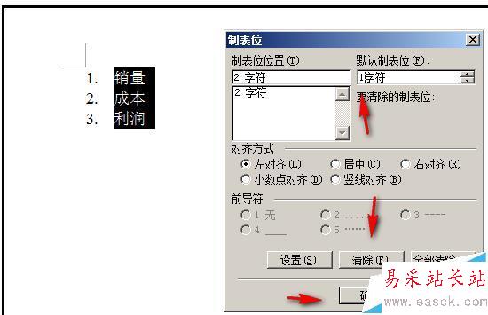 4、彈出的設置框中;在“默認制表位”下方的輸入框中輸入1;然后,再順序點:清除-確定;