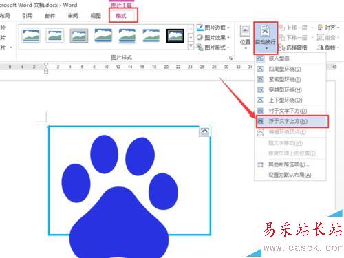 4、選中圖片,依次點(diǎn)擊“格式”>“自動(dòng)換行”>“浮于文字上方”,然后調(diào)整圖片的大小和位置。