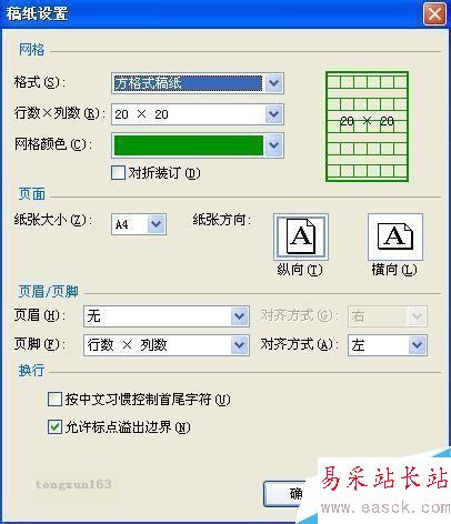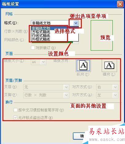 6、由于這里僅是告訴你如何增加,所以就不進行其他操作了,如果你有其他要求可以在相應的設置里進行設置,選擇“方格式稿紙”項后,界面發生變化,如圖: