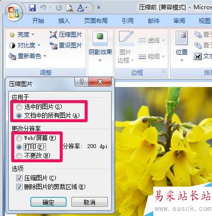 2、在壓縮圖片中選擇壓縮選中的圖片還是壓縮文檔中的所有圖片,然后在更改分辨率中根據需要選擇一種確定。