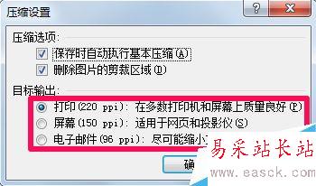 3、在壓縮設置中根據個人需要點選目標輸出的形式,最后確定保存,此時Word中的所有圖片就全部被壓縮了。