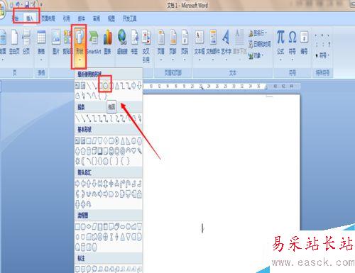 1、打開word 2007,【插入】菜單-【形狀】插入【橢圓】形狀。如下圖所示: