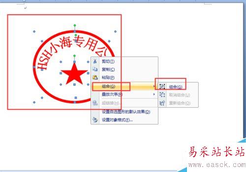 按住【Ctrl鍵】同時選中【藝術字】【橢圓】【五角星】形狀,進行右鍵組合。如下圖所示: