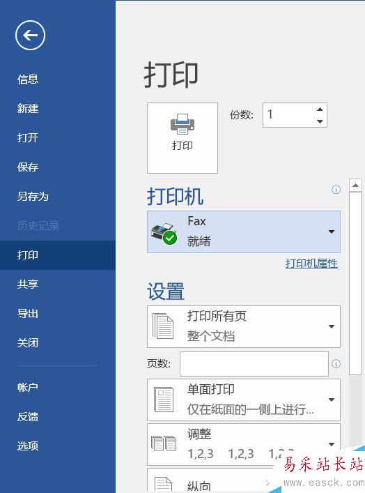 首先,在要保存成TIFF圖片格式的Word文件中選擇打印(Ctrl+P),點擊打印機下的下拉菜單,選中“Fax”,然后點擊打印。