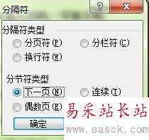 5、有些人肯定好奇了,怎么做到的呢?下面就教給大家了。首先,我們把前三頁和后兩頁分節(jié)。具體做法就是,將光標(biāo)移動(dòng)到第四頁頁首,然后依次點(diǎn)擊插入——分隔符——分節(jié)符類型——下一頁——確定。將這幾頁分成兩節(jié)。